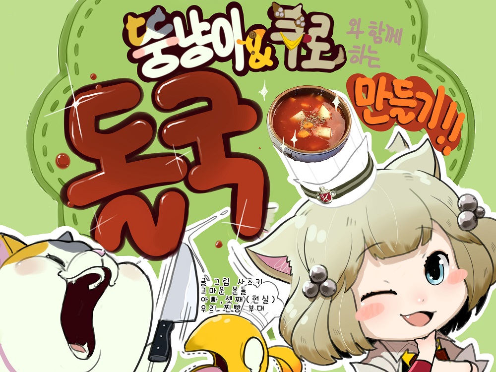 뚱 : 냥하세요~~~~녀러분~~~~당신도 할수있댜! 에에오르제아 요리샤! 당.할.에.요? 프로그램 진행을 맡계 된 뚱, 냥이 입니댜! 유후후~~~~반갑습니댜~~!!! 신체구조상 박수는 못쳐요!! 바로! 요리 소개로 넘어가 볼계요! 오늘 만들 요리는..!! 두구두구두구두구두구두굳