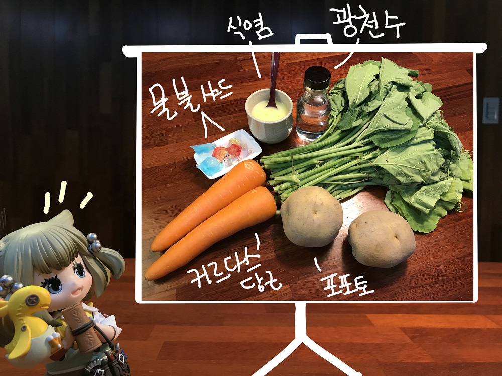 쿠 : 재료! 1인분 기준- 광천수55ml, 커르다스 당근 한송이, 식염 한 컵! 포포토 한 개 반덩이~ 물,불 샤드 각각 한조각씩! 몰볼 아니에요!