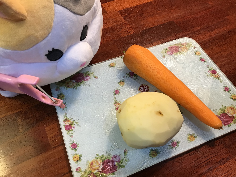 뚱 : 앗, 죄송합니댜- 아직 썰면 안되냥. 먼저 재료를 깨끗치 씻고 껍집을 벗겨줘야 한답니댜. 쳇(칼넣