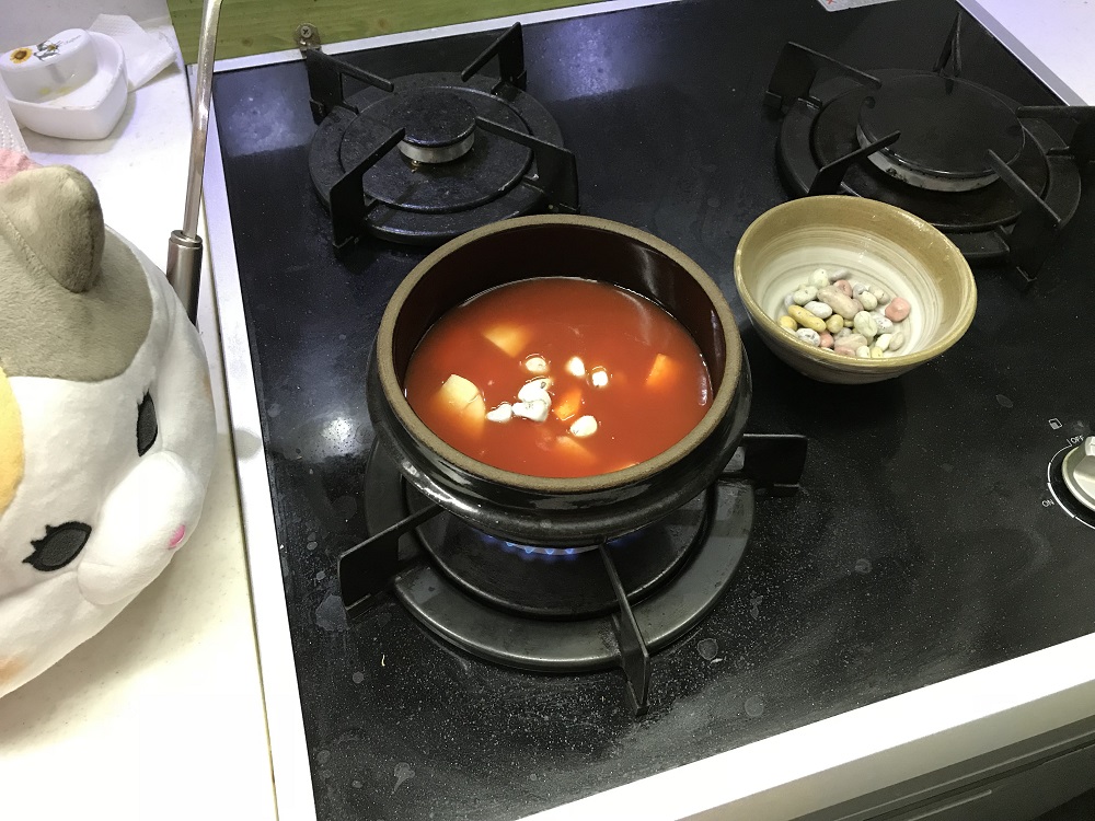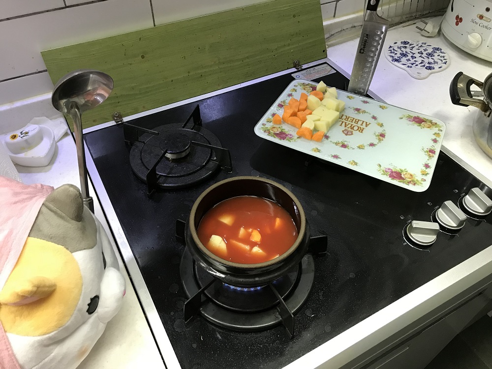 뚱 : 왠지 뚝빼기랴는 말이 잘 어울리는 냄비를 가져왓어요! 맞아요, 냄비가 냄비 구실만 할 수 잇으면 되죠 흐규흐구ㅠ 준비해두엇뎐 광천수와 물불샤드, 커르다스 당근과 포퐅토를 넣고 끓여줍니댜!