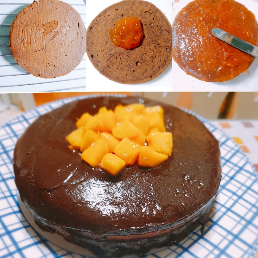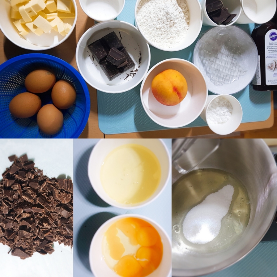 재료:버터,슈가파우더,타크초콜릿,계란4개,박력분,판젤라틴 두장,설탕,바닐라 엑스트릭.살구(같은 복숭아),살구잼