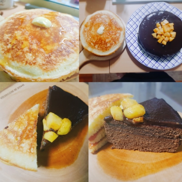 위에다 버터를 올리고 시럽을 마구마구 뿌려주면 완성이랍니다!
