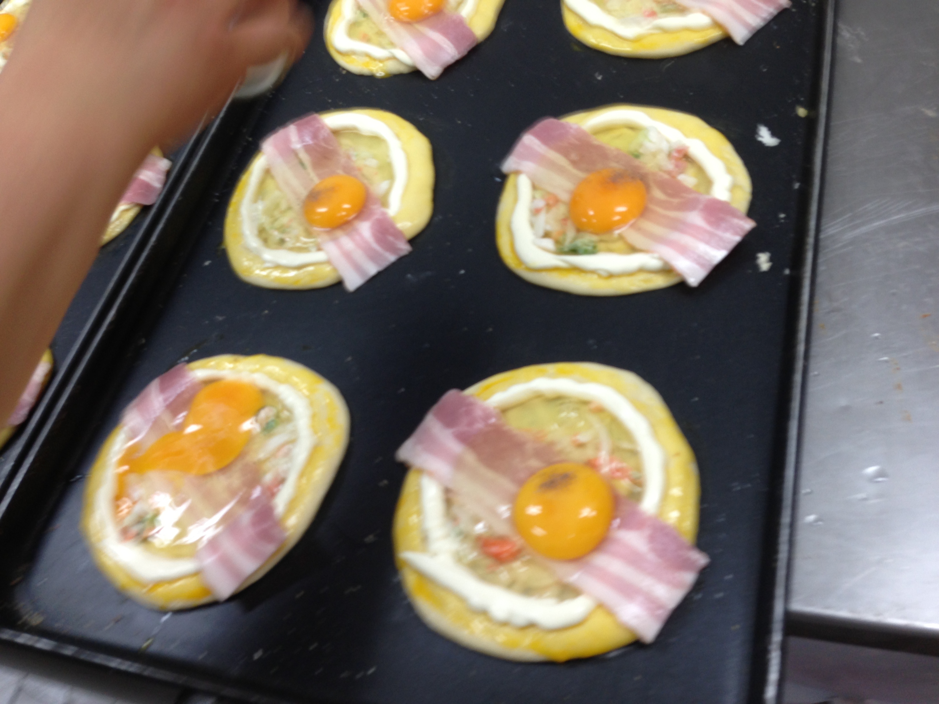 발효 되시면 중간을 손으로 눌러줌니다 양파 당근 햄 중간에 넣어 주시구용 베이이컨 2장 깔아주고 계란 중간에 한개 깨주시구용