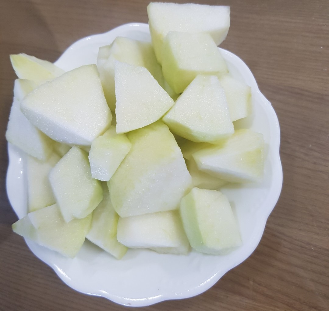 사과의 껍질을 깎아 먹기 좋은 크기로 깍뚝깍뚝 썰어줍니다.