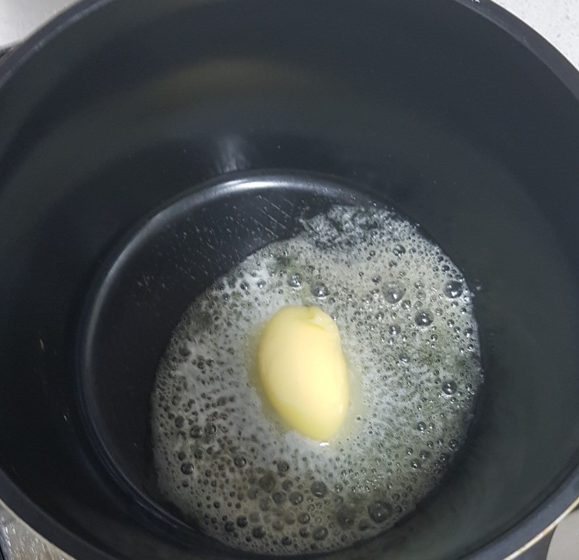 라면 끓여먹는 냄비에 버터 아빠 1스푼을 약불에 녹여줍니다!