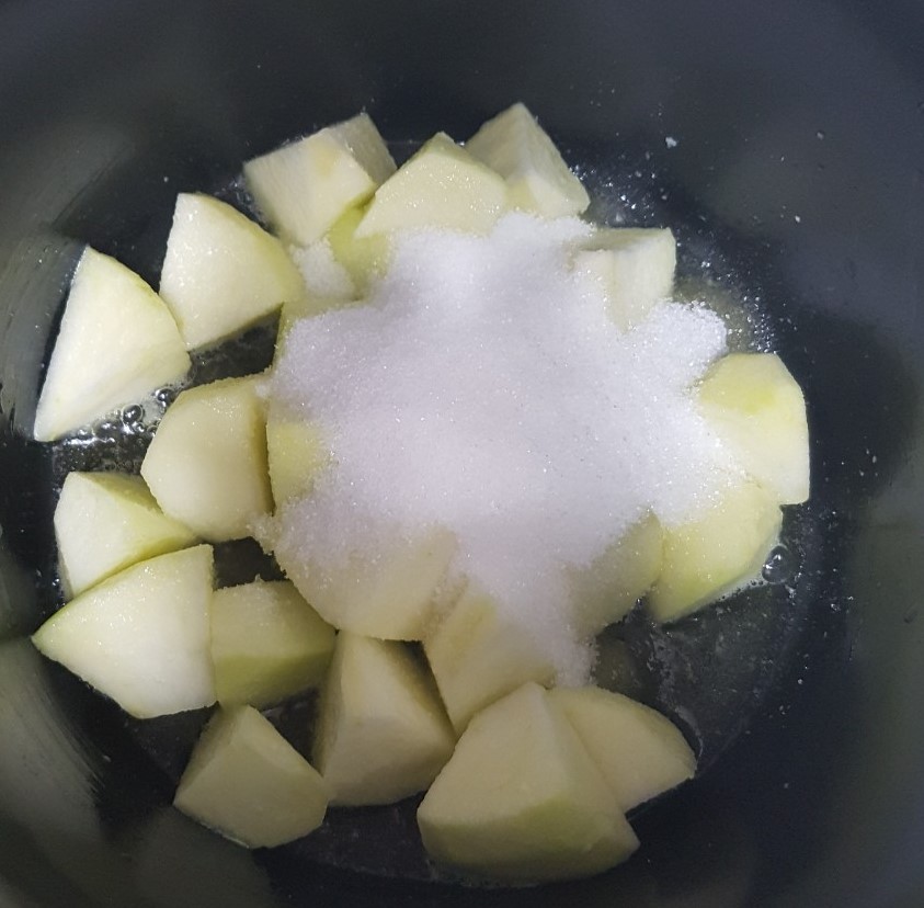 다 녹은 버터에 사과를 넣고 볶다가 설탕 투하!