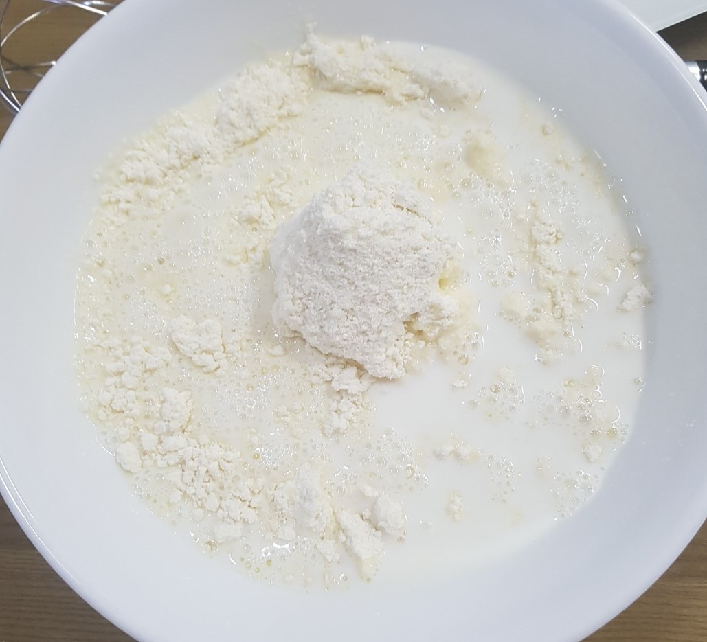 4. 간이제작한 핫케이크 가루 아마도 250g +우유 아마도 250ml 을 섞어줍니다.