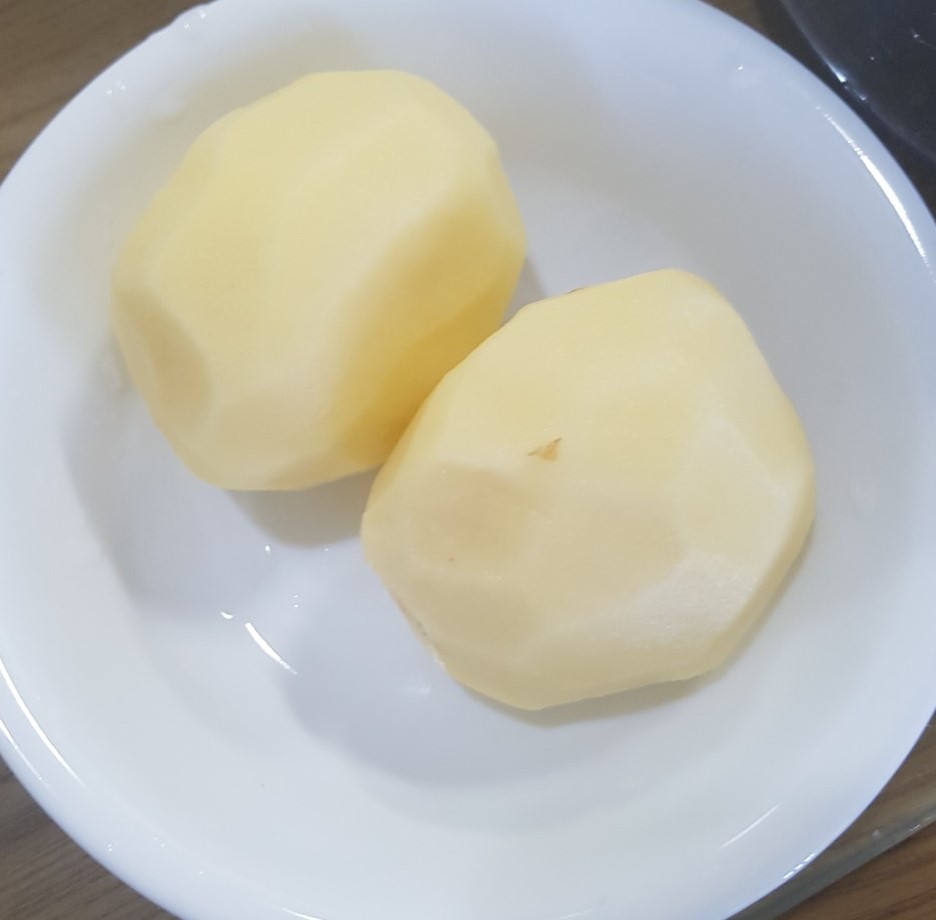 5. 노란 포포토 두 알을 깨끗이 씻어 껍질을 깎아 준 후.