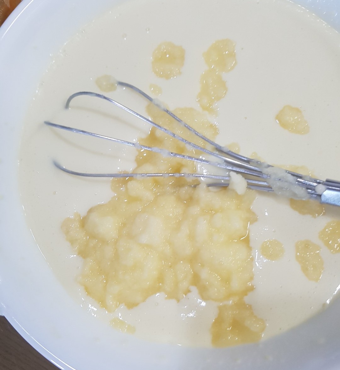 7. 강판에 갈아버린 포포토를 핫케이크 반죽에 넣어줍니다.