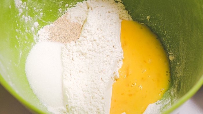 A 그릇(연두색)에 인스턴트 드라이 이스트 + 설탕을, 그 후에 밀가루로 벽을 세워서 옆에는 계란1개를 풀어서 넣어줘요.