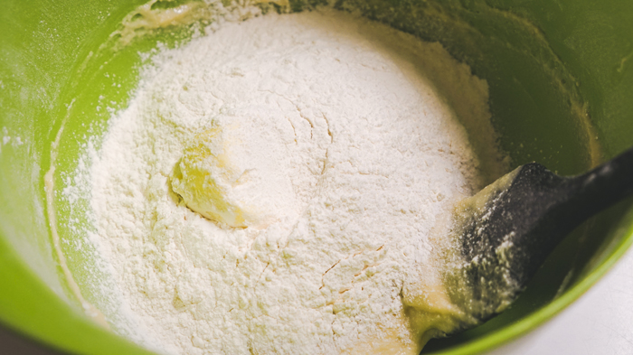 매끈해지면 B그릇에 있는 밀가루 + 버터 + 소금을 A그릇에 넣고 다시 잘 섞어주세요.