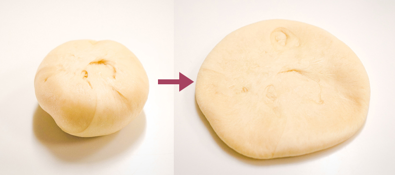 뒤집어서 손바닥으로 꾹꾹 눌러서 가스를 빼주고, 호떡 반죽마냥 납작하게 눌러줍니다.
