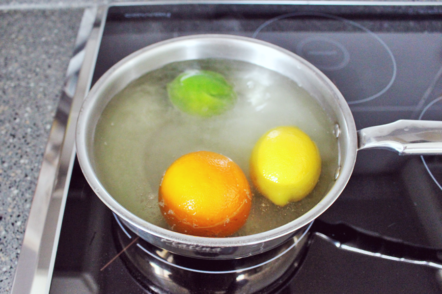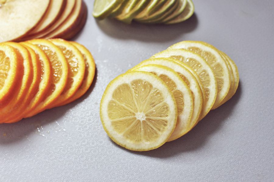 끓는 물에 오렌지와 레몬, 라임을 넣고 표면만 살짝 데치는 느낌으로 넣었다가 건져줍니다.