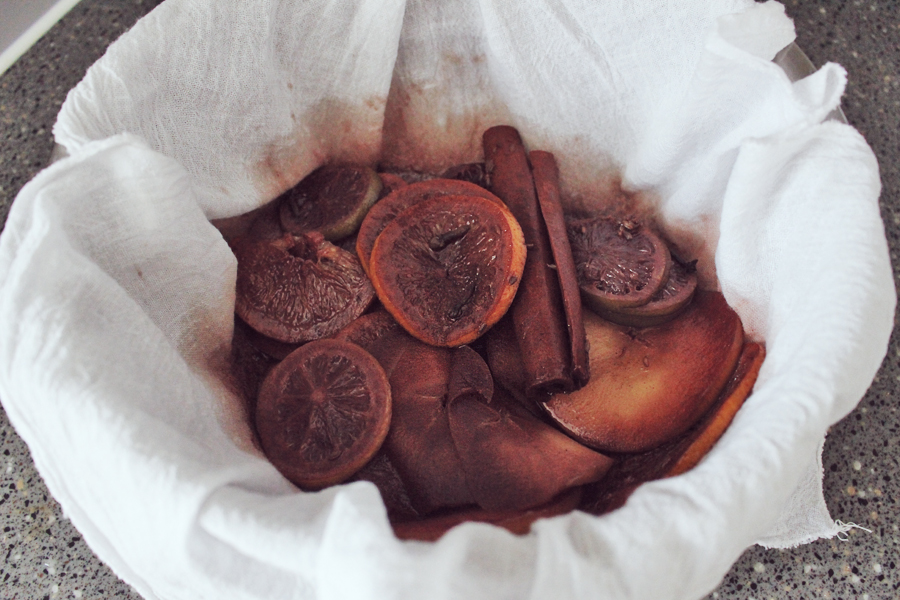체와 면보에 받아 과일과 향신료를 걸러내 줍니다.