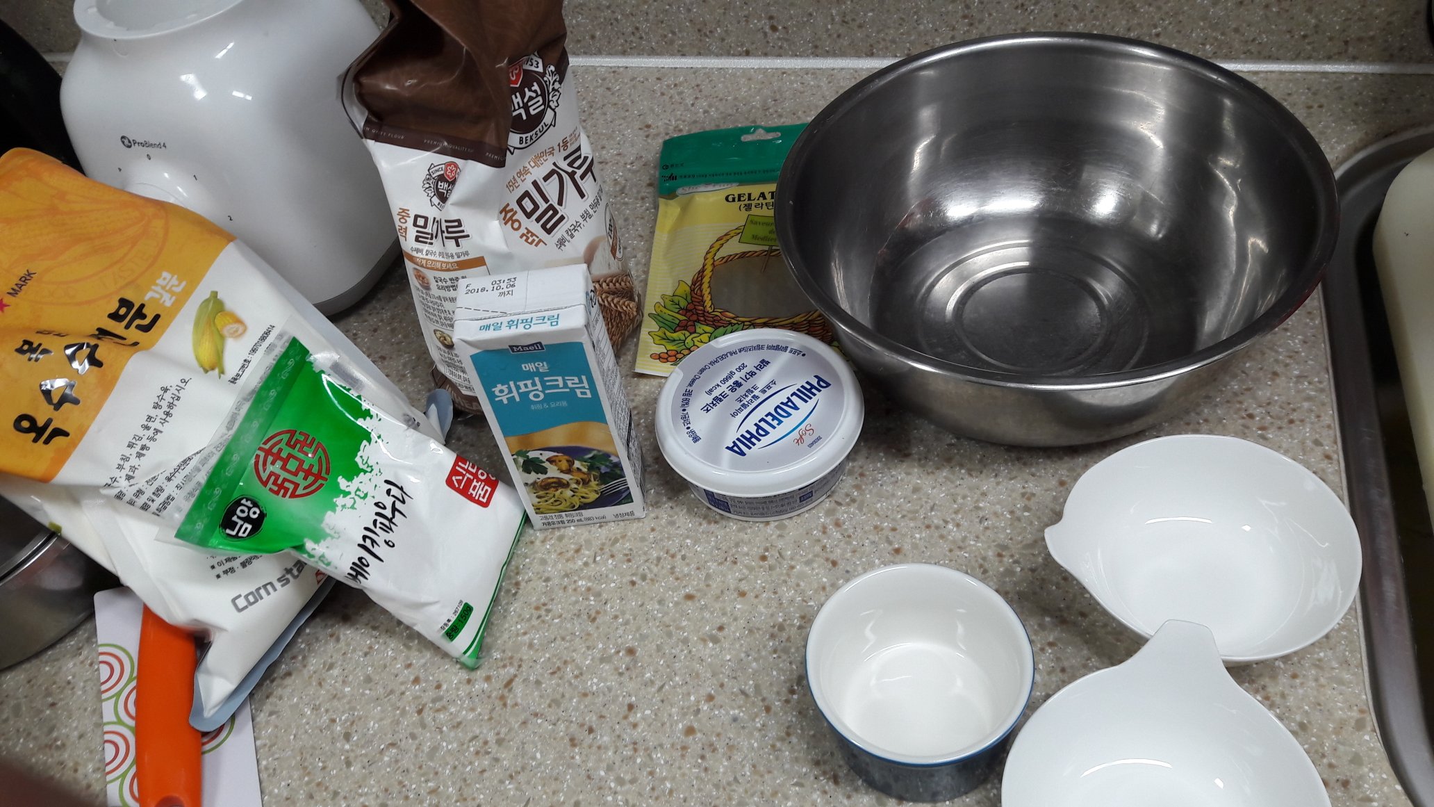 치즈케이크-크림치즈 200g,휘핑크림(혹은 생크림 250ml) 250ml,계란2개,설탕50g,박력분 45g,레몬가루1T