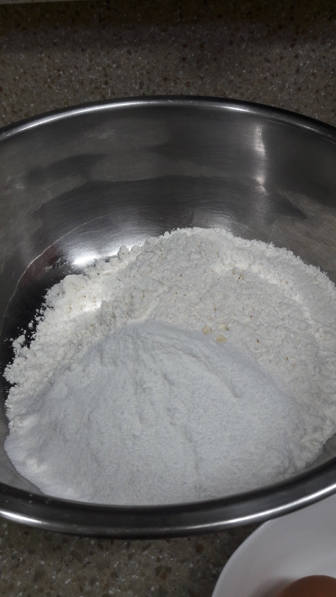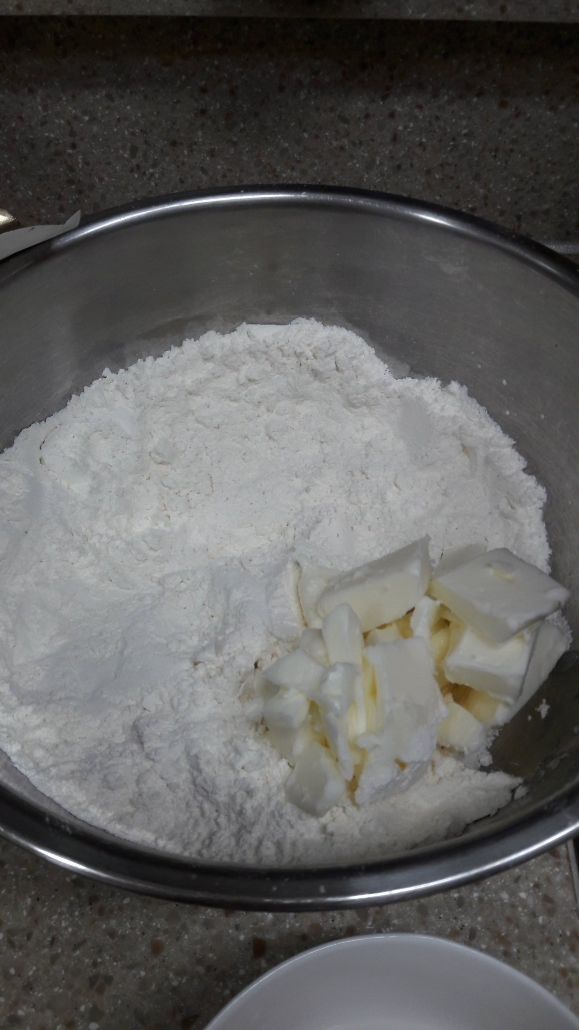 먼저 파이지를 만들거에요! 중력분이랑 슈가파우더는 같이 넣어서 체를 친후에 버터를 넣어서 손으로 버터를 누르면서 반죽이 부스러기처럼 되게 해주세요