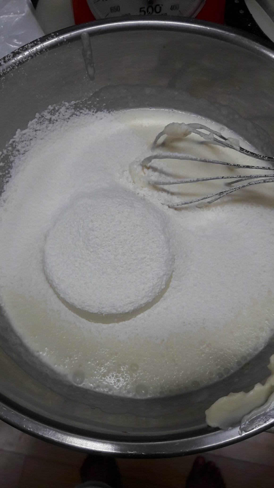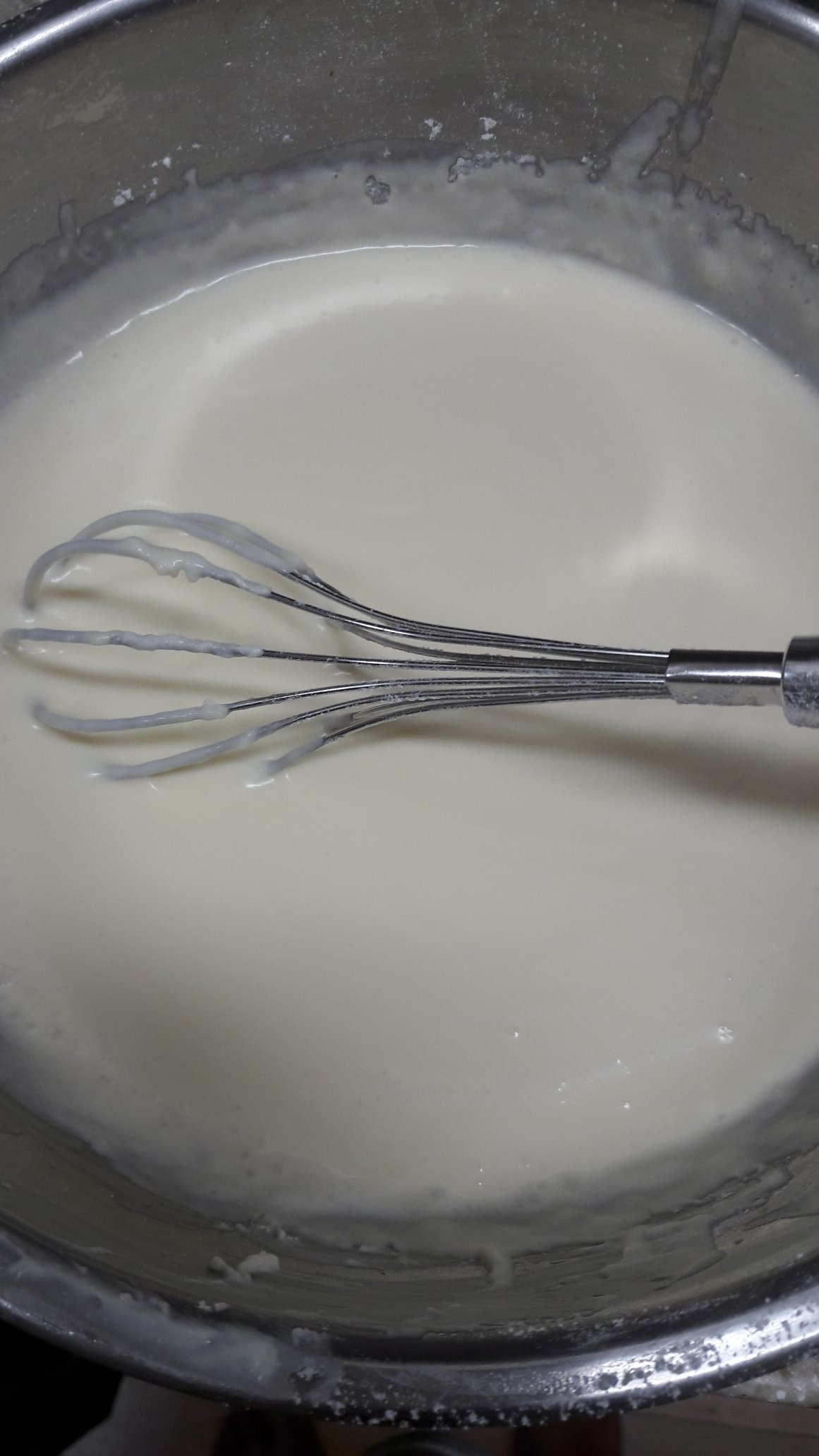 먼저 계란2개랑 설탕을 넣고 설탕이 녹게끔 휘저은 다음,휘핑크림(혹은 생크림)을 넣어줍니다.