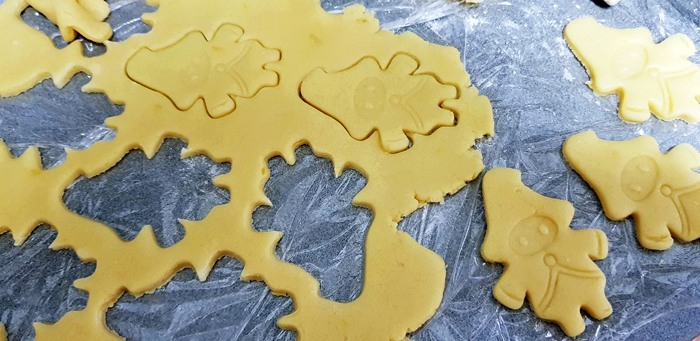 휴지가 끝나면 덧가루를 뿌리고 밀대로 밀어준 뒤 쿠키커터로 찍어냅니다. 커터는 주문제작했습니다.
