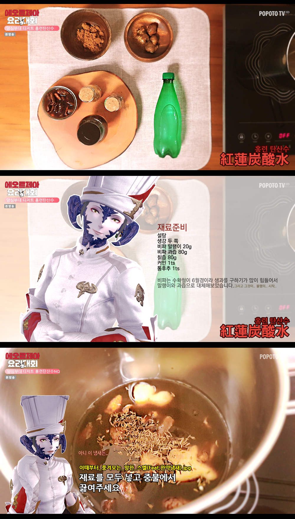 어멋! 넘나 맛있어 보여요! 에오르제아에서 튀어나온 것 같아요~ /박수/박수 편집하신 것도 정성이~~크흐~~~ 요즘 인겜에서 홍련탄산수를 자주 먹는데 실제로 맛도 궁금하네여! 여러모로 수고 많으셨습니다~~^0^