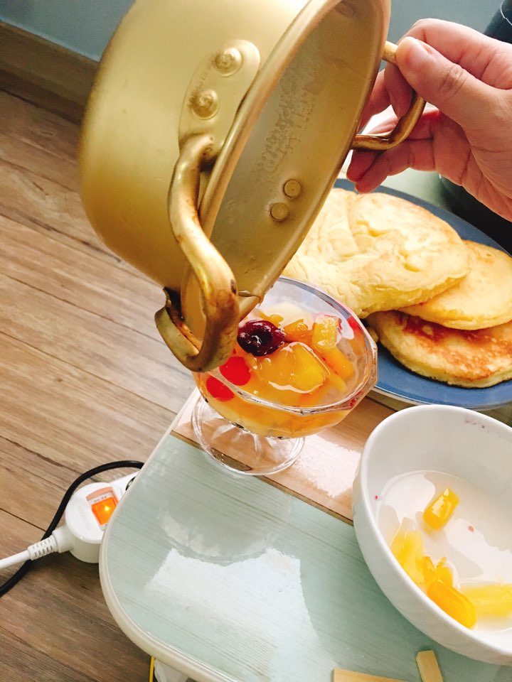 왜냐면 팬케이크니까요... 감로꿀도 맛있겠지만 우리는 설탕절임과일을 얹고싶었어요.