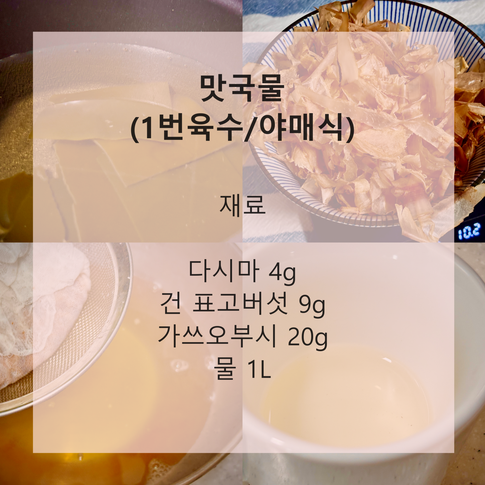 맛국물 1번(이하 1번 육수)은 깔끔하고 담백하게 향을 내는 장국자체가 면을 감싸거나 하는