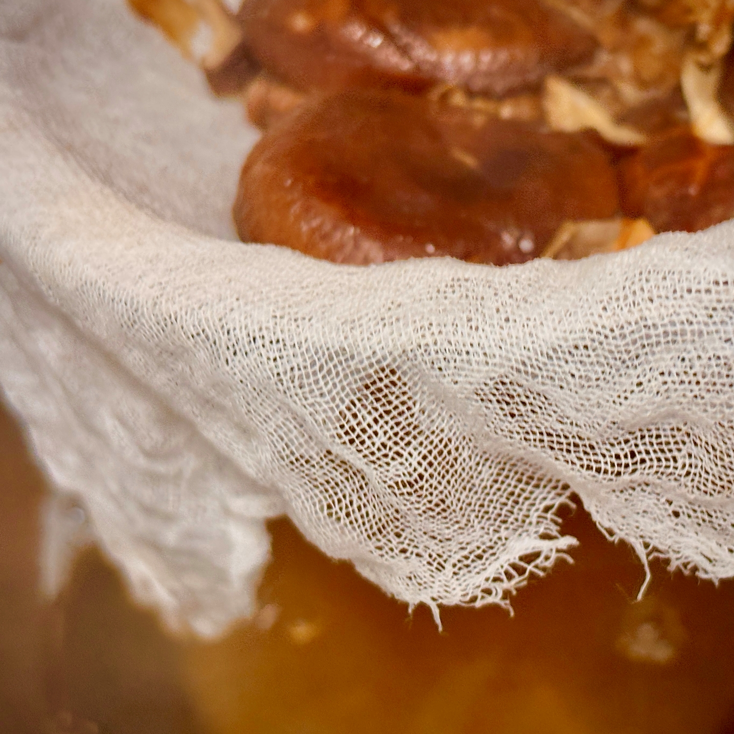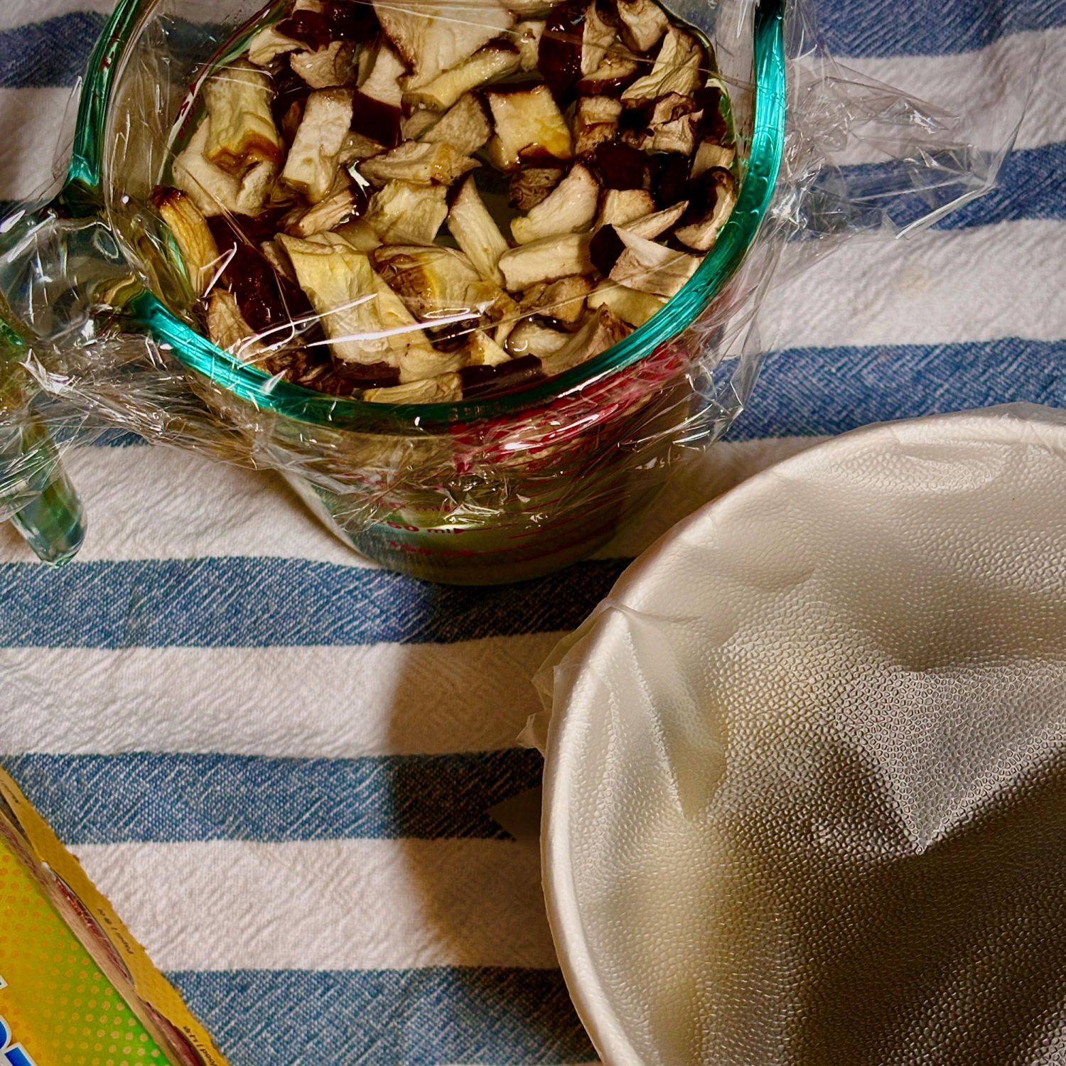 2. 말린 표고버섯 불린 물과 다시마 불린 물을 면보를 깐 채반에 받혀 이물질을 걸러내 줍니다.