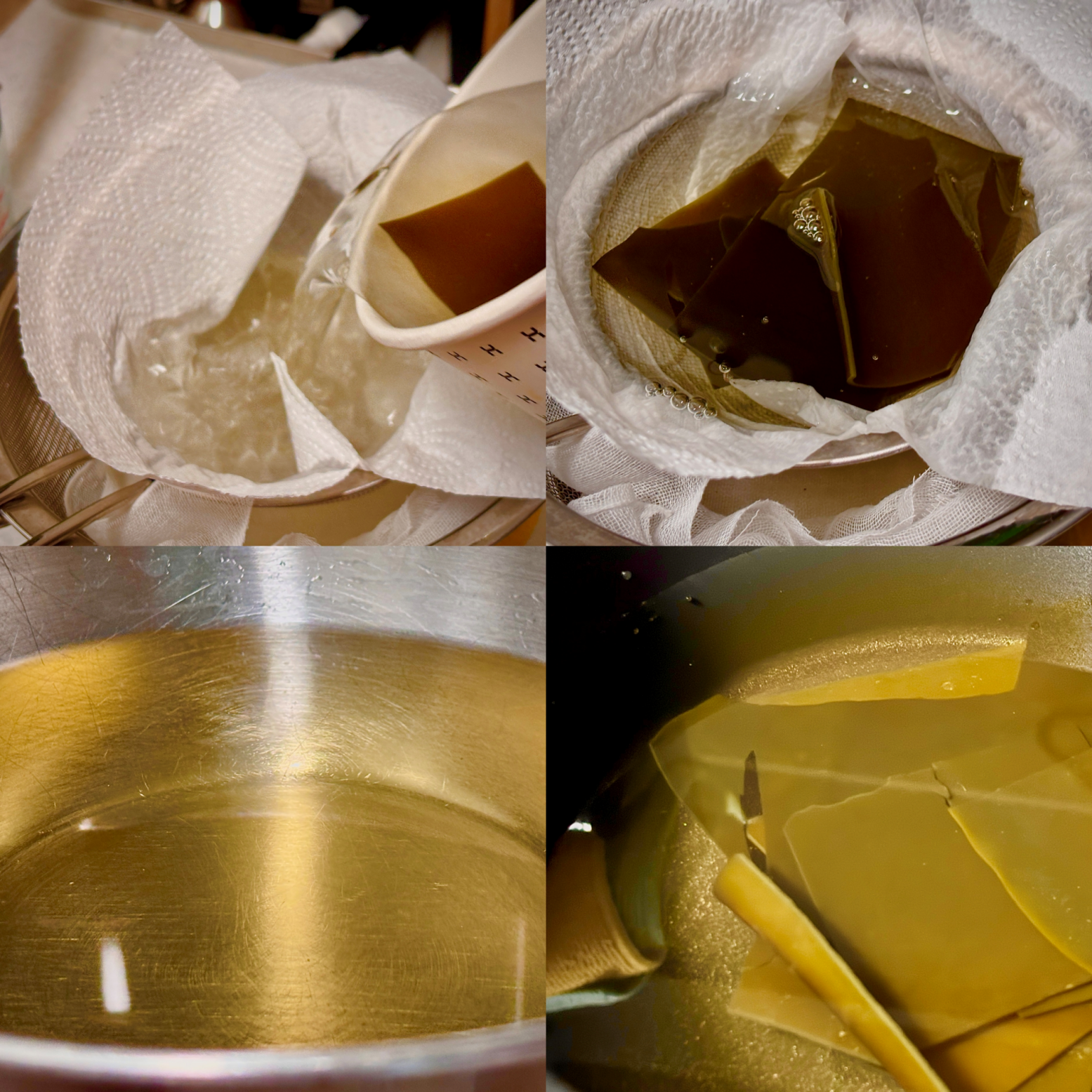 5. 육수는 3분간 끓였다가 면보를 받쳐 가쓰오부시와 분리하여 꾹 짜냅니다.