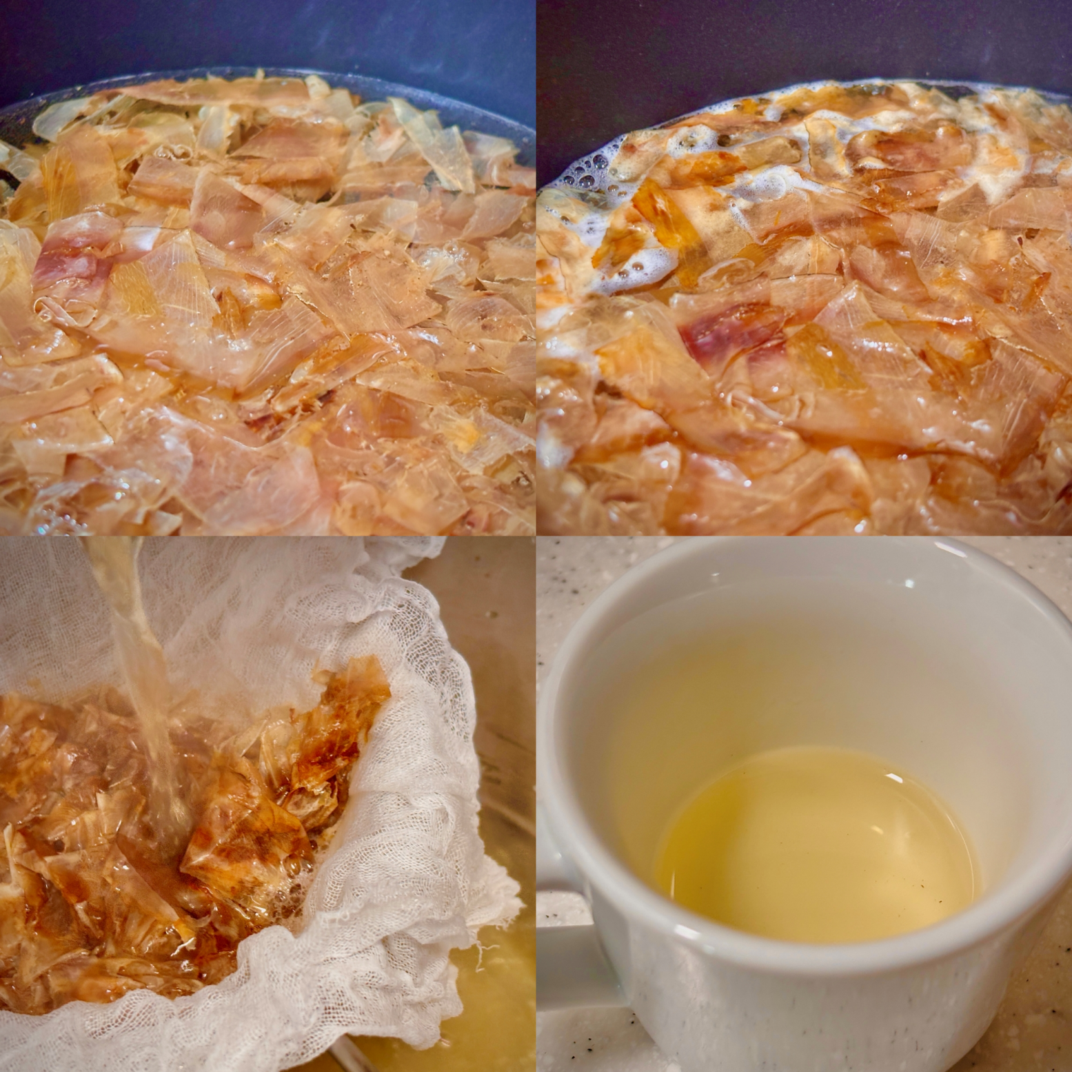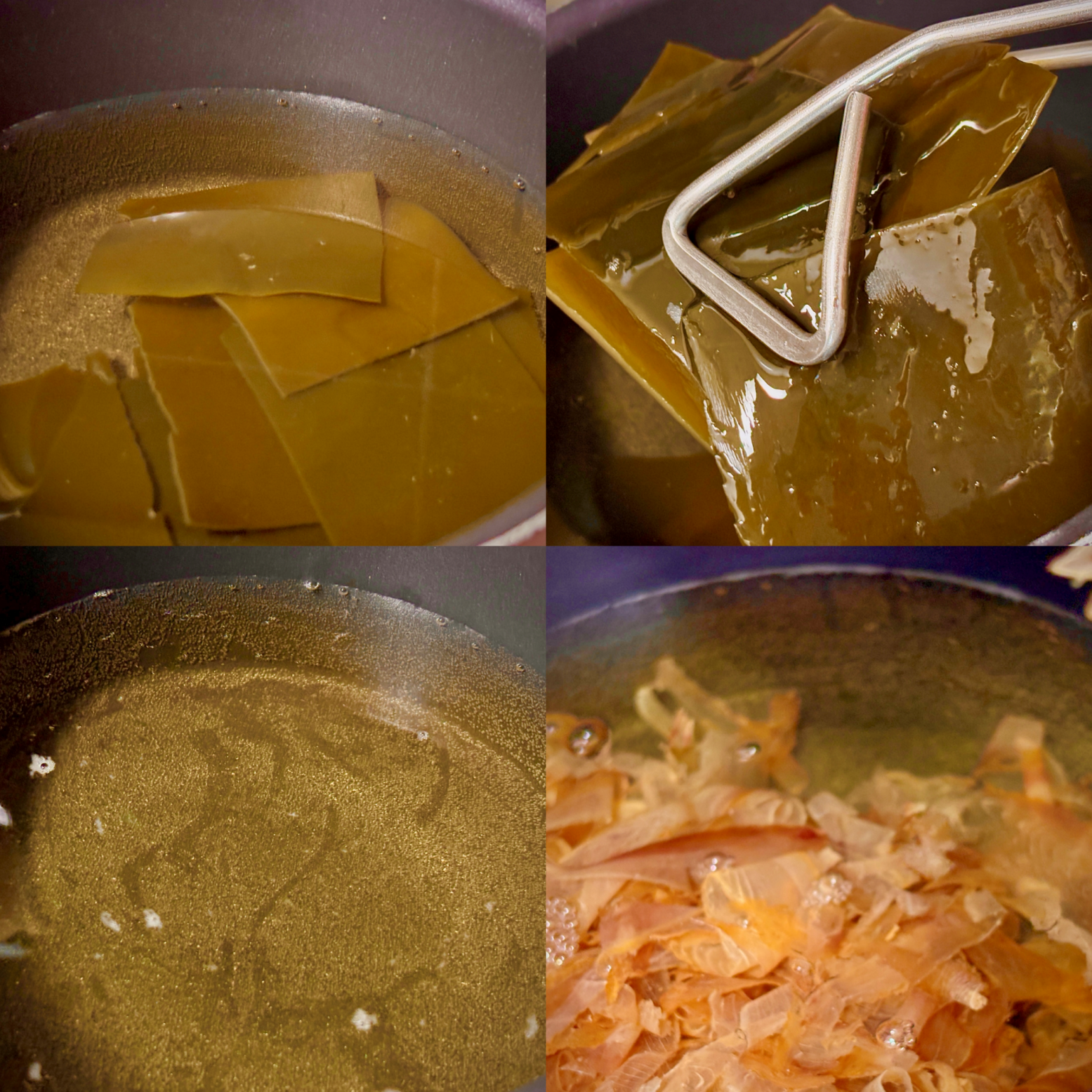 가쓰오부시는 너무 오래 우려내면 맛이 좋지 않으니 최대한 3분이상 방치하지 않는 정도를 지켜줍시다.