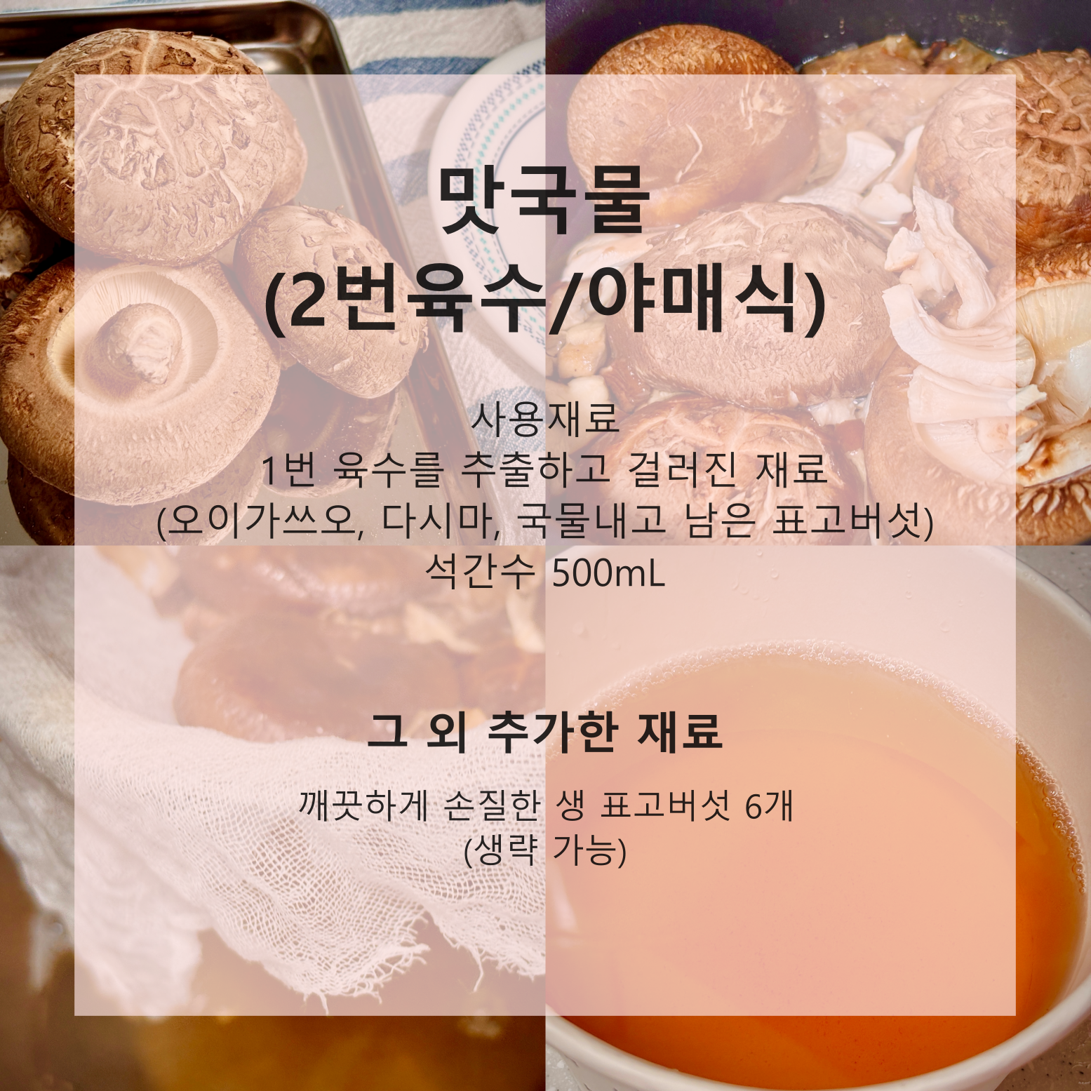 맛국물 2번(이하 2번 육수)은 조림, 국에 사용하는 베이스 라고 생각하고 제작하였습니다.