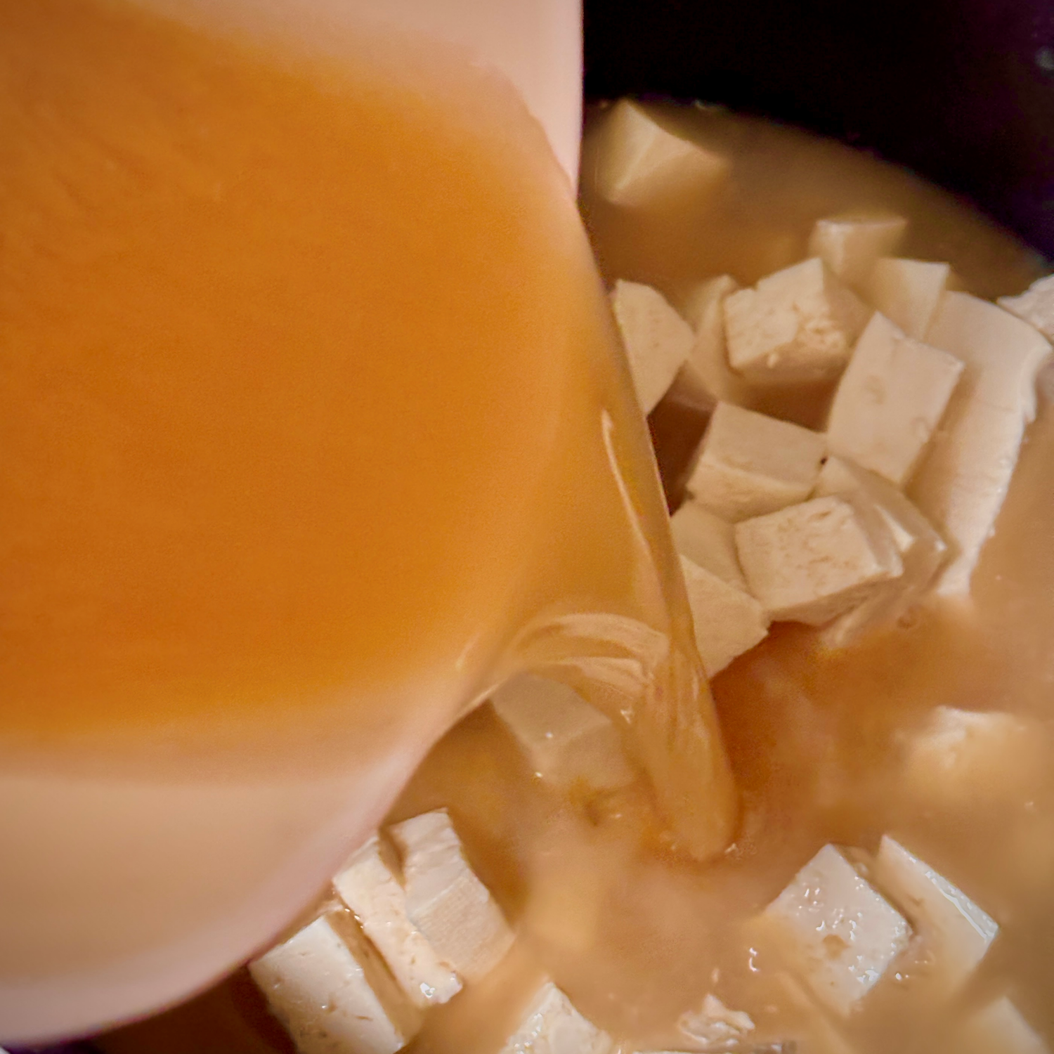 3. 된장과 맛국물을 혼합한 액체를 냄비에 붓고 두부와 함께 끓입니다. 이 때 혼합물의 염도가 강한지 미리 간을 본 후 석간수(150mL, 저는 저 정도 넣었지만 다른 분들은 더 넣으시거나 덜 넣으셔도 좋습니다)를 더 추가합니다.