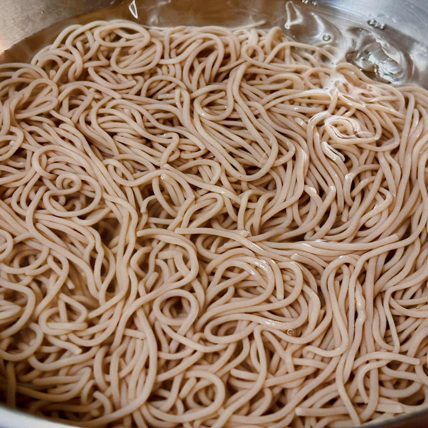 6. 끓는 물에 메밀 면을 3분 간 익힌 후 흐르는 물에 살살 비벼 면에 남은 전분을 제거한 후 얼음 물에 넣어 면을 차게 해 줍니다.