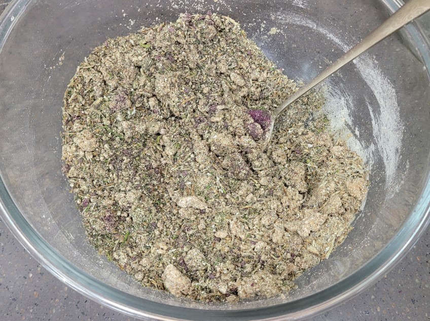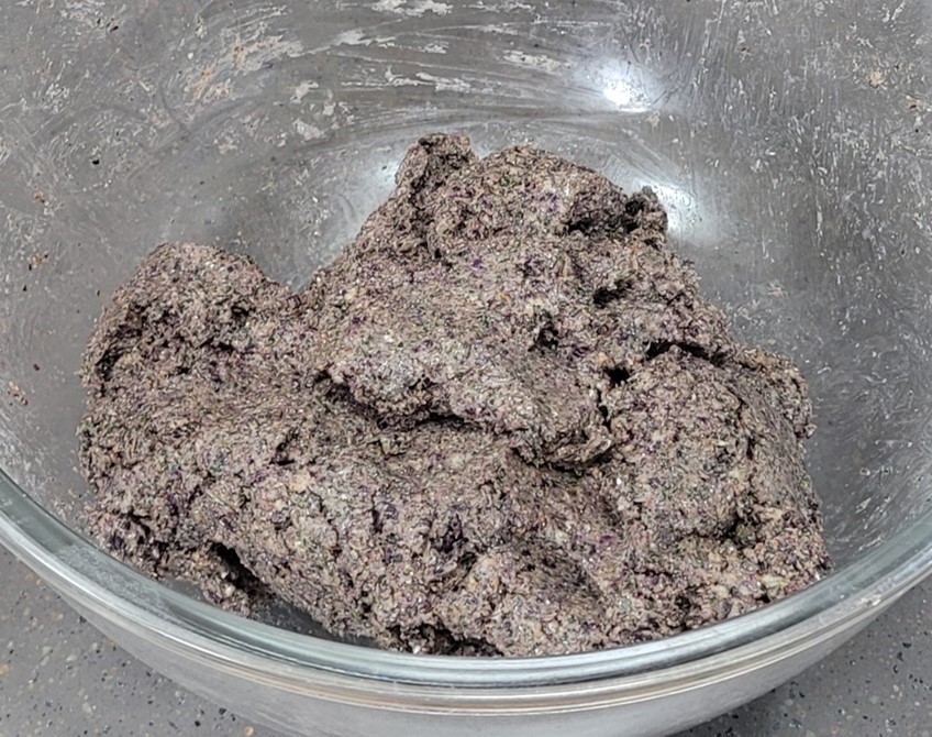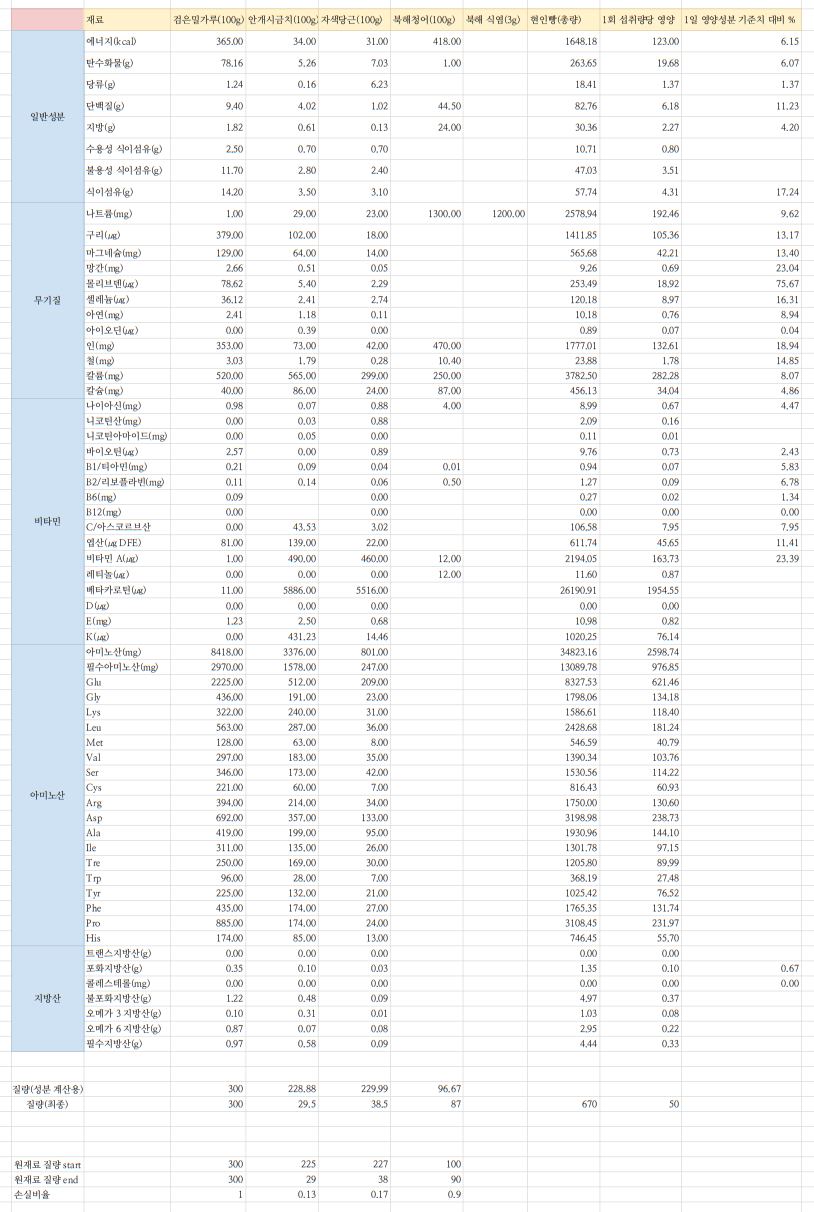 호밀 총 300g에 시금치가루 29.5g, 자색당근가루 38.5g, 청어가루 87g이 들어갔습니다. 이로써 영양성분을 계산할 수 있게 되었습니다.