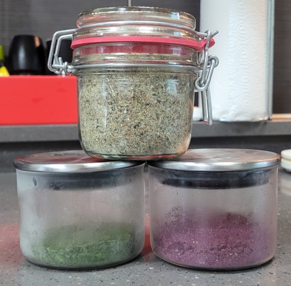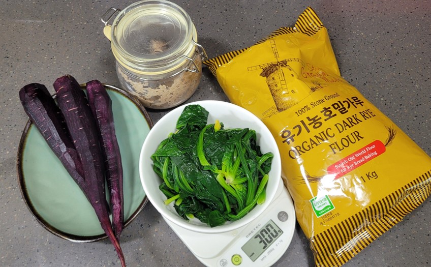 [Fig 3. 현인빵 재료—왼쪽부터 자색당근, 발효종, 데친 안개시금치, 검은밀가루]