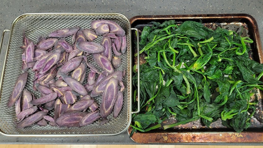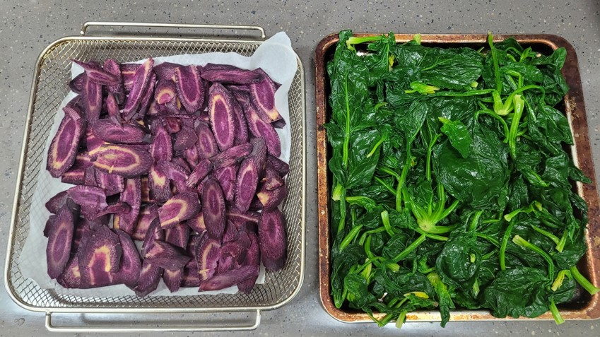 [Fig 4. 마르기 좋게 잘라서 펼쳐둔 자색당근과 안개시금치]