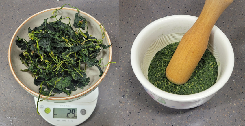 [Fig 6, 7. 지갑만큼 말라비틀어진 안개시금치 / 분쇄한 결과]