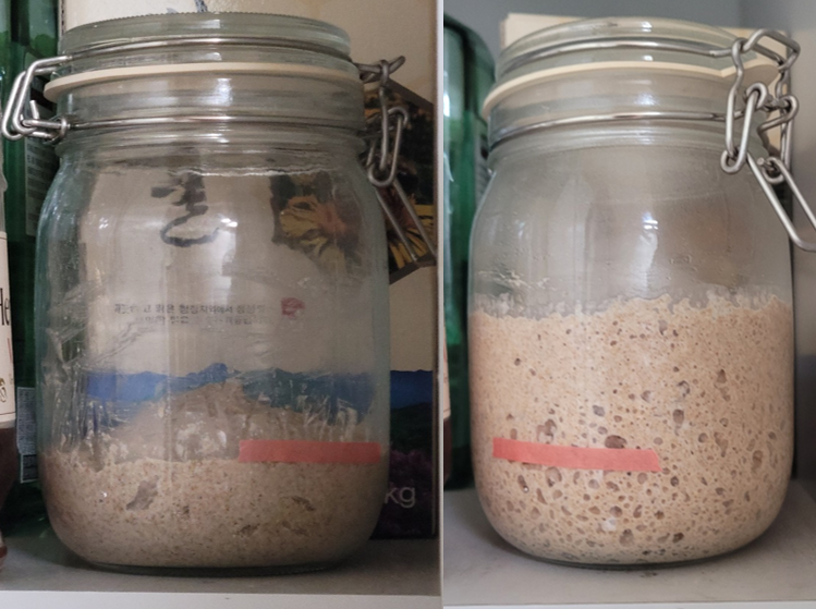 반죽 전날 호밀 150g을 전발효합니다. 수분율 100%로 섞어 재워둔 뒤 다음날에 확인하면 잘 발효된 것을 확인할 수 있습니다.