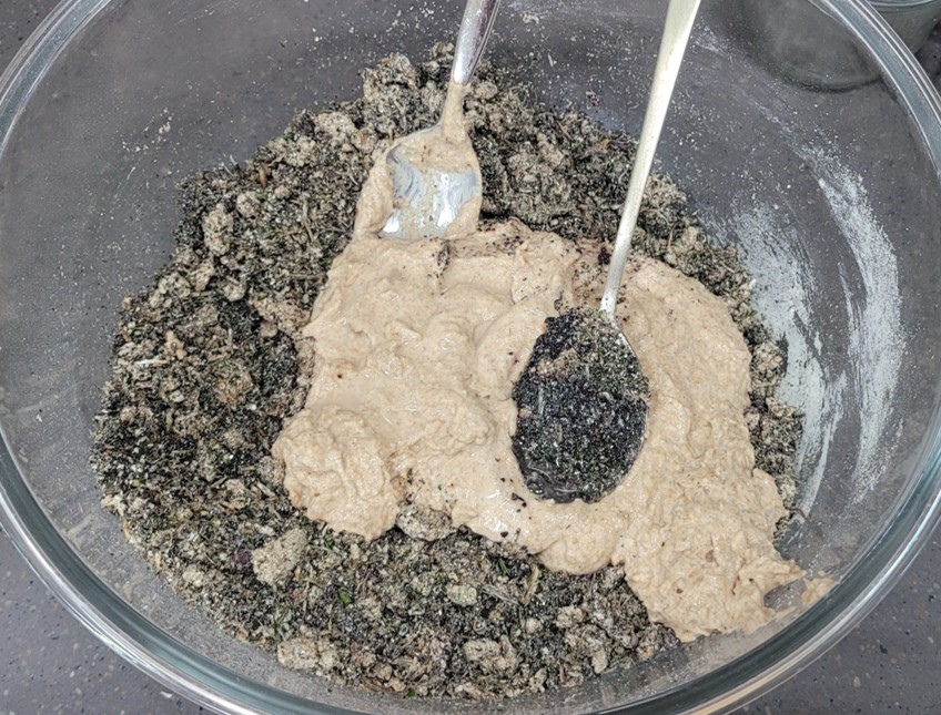 남은 호밀 150g에 끓는 물을 100g 섞어 호화시킵니다. 야채가루와 생선가루 또한 계량해서 넣습니다.