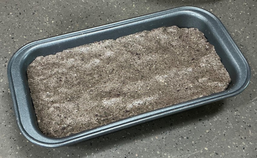 기름칠한 식빵 틀에 넣고 최대한 눌러 끝까지 채워줍시다.