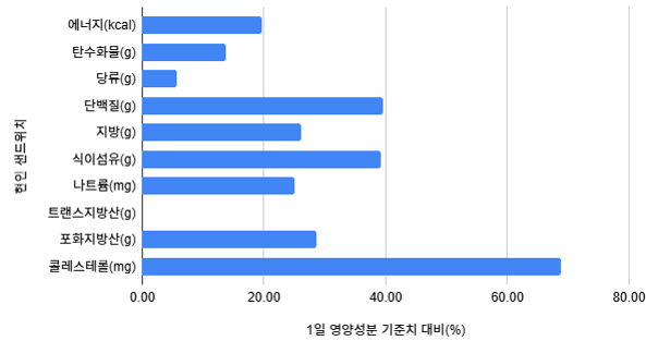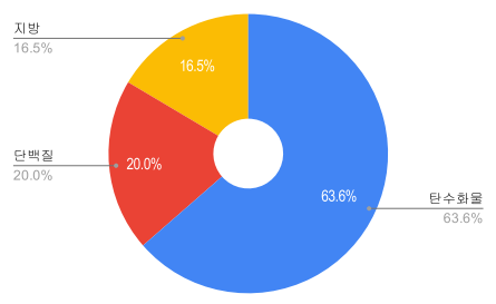 먼저 탄단지 비율을 살펴보면 탄수화물이 63.6%, 단백질이 20.0%, 지방이 16.5%를 차지합니다. 건강에 이상이 없는 성인의 경우 식단 비율을 탄수화물 45-65%, 단백질 10-35%, 지방 20-35%를 목표로 삼아야 하므로 지방만 적당량 추가해 주면 문제가 없습니다.
