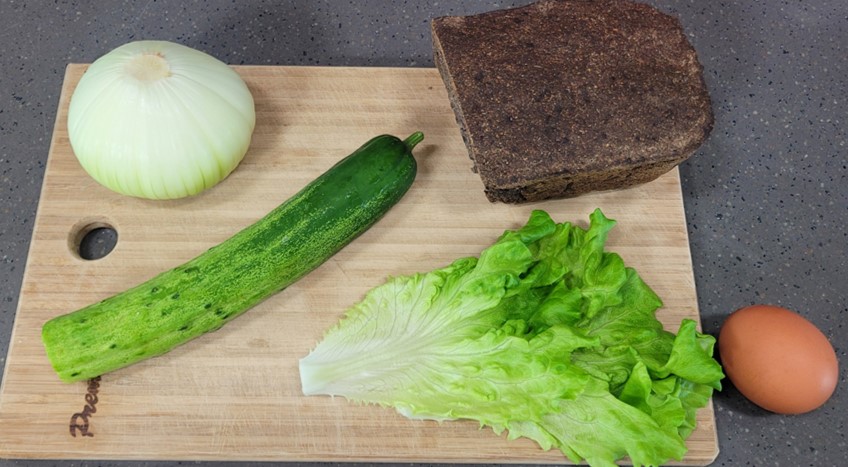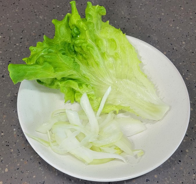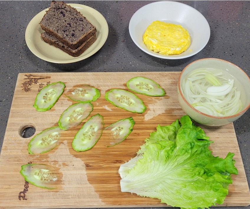 외계양파는 얇게 썰어 찬물에 담가 매운맛을 빼줍니다. 오이 또한 얇게 썰고 북해 식염을 살짝 뿌려 수분과 쓴맛을 뺍니다. 아이스버그 양상추는 잘 씻고 현인빵은 두 조각 잘라줍니다. 엘피스 새알 1개로는 간단하게 오믈렛을 해줍시다.