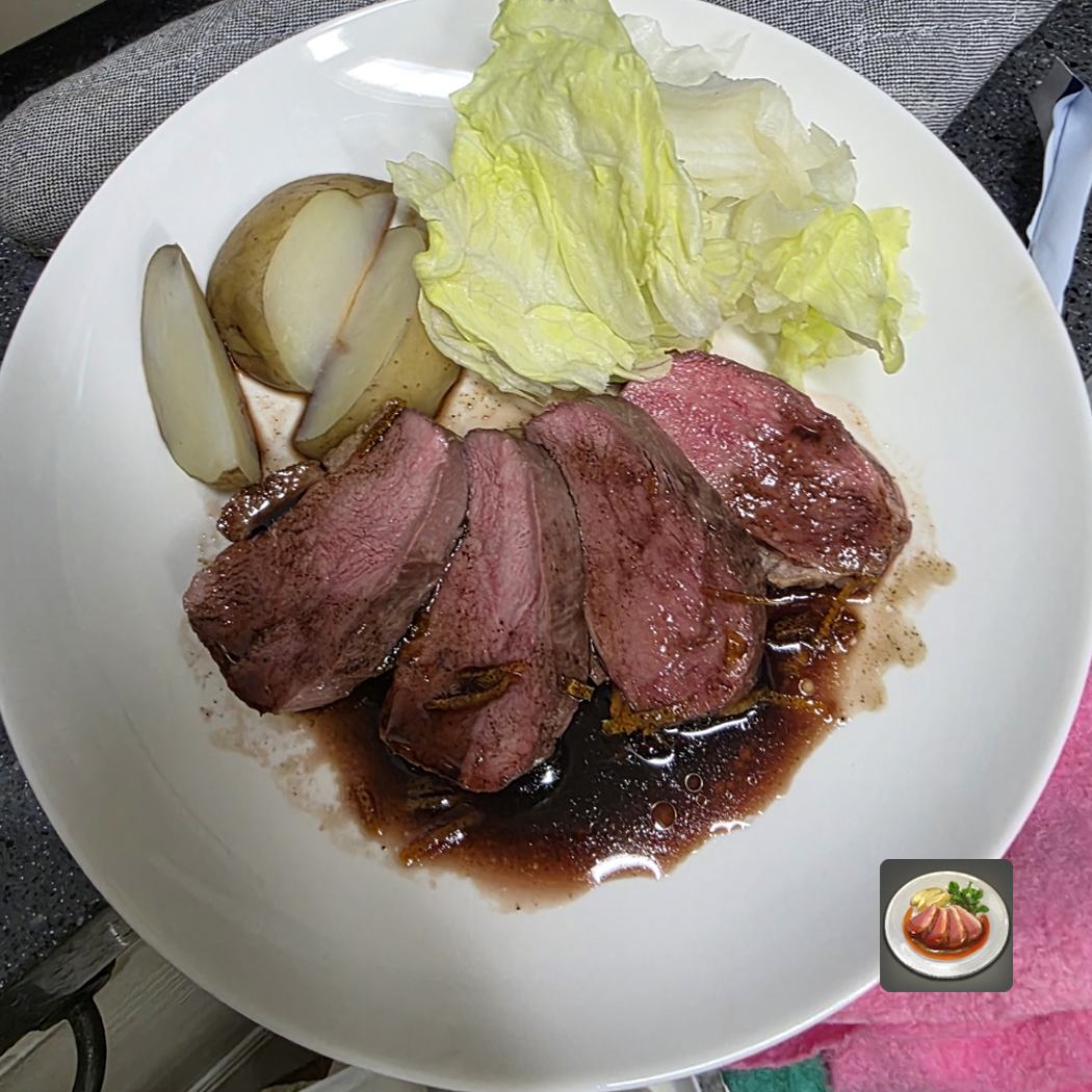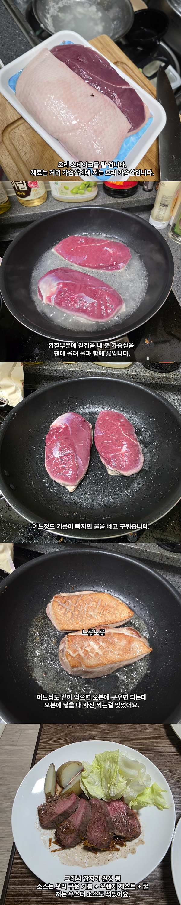 오리 스테이크 : 가슴살이지만 식감이 부드럽습니다. 껍질때문인지 기름기가 상당히 있는편이라 팬에 굽고 오븐에 다시 익혀도 기름이 줄줄 나와요.