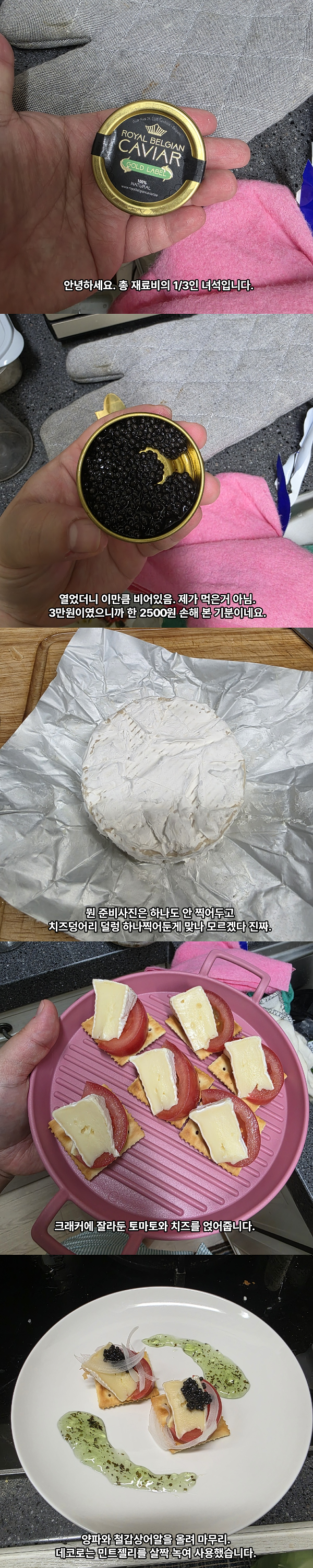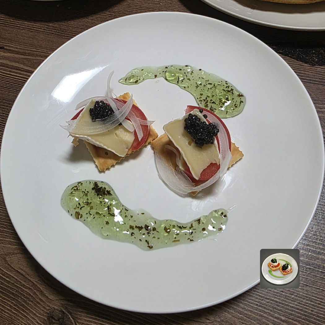 철갑상어 알 카나페 : 브리치즈와 캐비어가 짭짤하지만 토마토덕에 중화되는 느낌입니다. 양파와 토마토덕에 약간의 단짠단짠 조합이라고 생각해도 무방 할 것 같습니다.