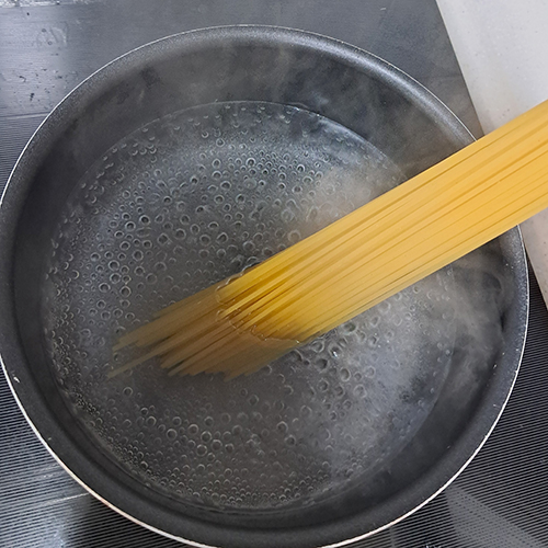 물에다가 굵은 소금을 넣고 스파게티를 삶아줍니다.