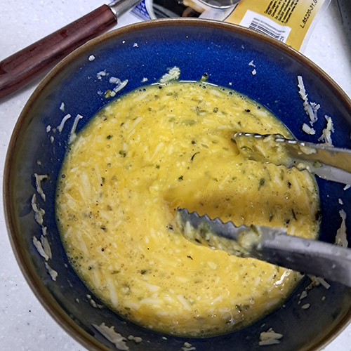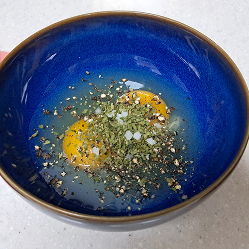그릇에 인분 수에 맞춰 달걀 두개와 약간의 간(소금)과 풍미(파슬리+통후추 갈갈)를 더해줍니다.