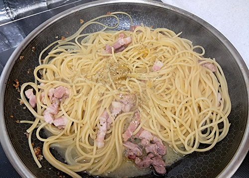 5. 베이컨이 거의다 익었을때 면과 면수와 오레가노와 치킨스톡을 넣고 잘 섞어줍니다.