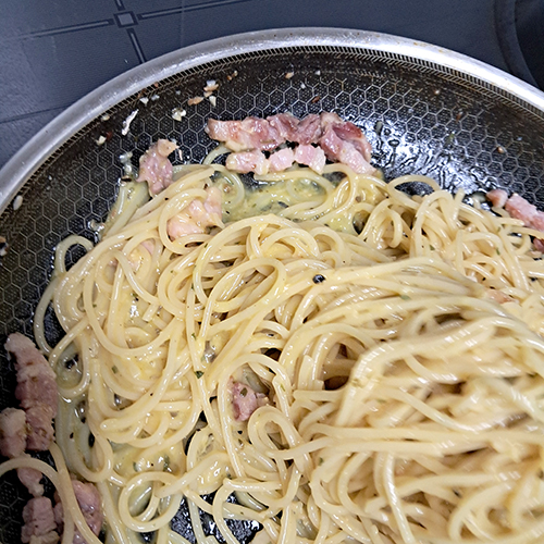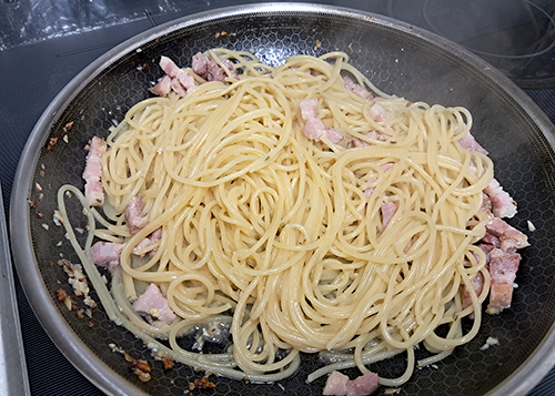 파스타 내부 온도의 열기가 조금만 남았을 때 잔열로만 소스와 면을 섞어주면