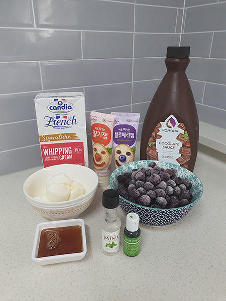 블루베리 소르베는 색을 잘 내주기 위해서 생크림과 섞지 않고 소르베로 만들어줬습니다.