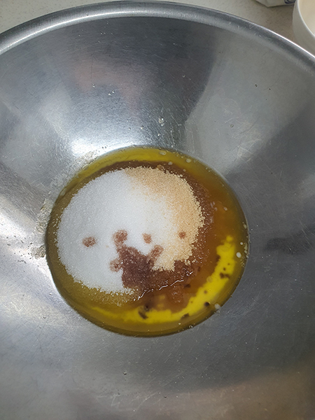 보울에 녹은 버터 56g에 설탕 100g, 갈색설탕 70g, 바닐라 익스트랙트 1티스푼을 넣고 잘 섞어준 후,