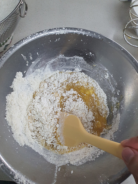 계란 2개를 넣고 밀가루를 조금씩 체쳐서 넣어가며 11자로 섞어줍니다.