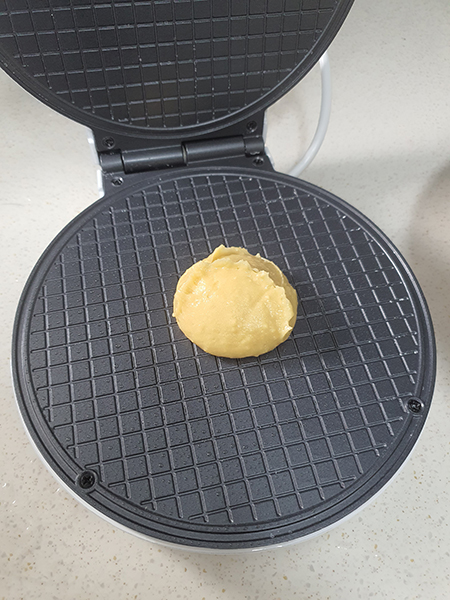 와플팬에 기름을 골고루 둘러준 후, 스쿱을 사용해서 반죽을 중앙에 놓고 눌러줍니다!